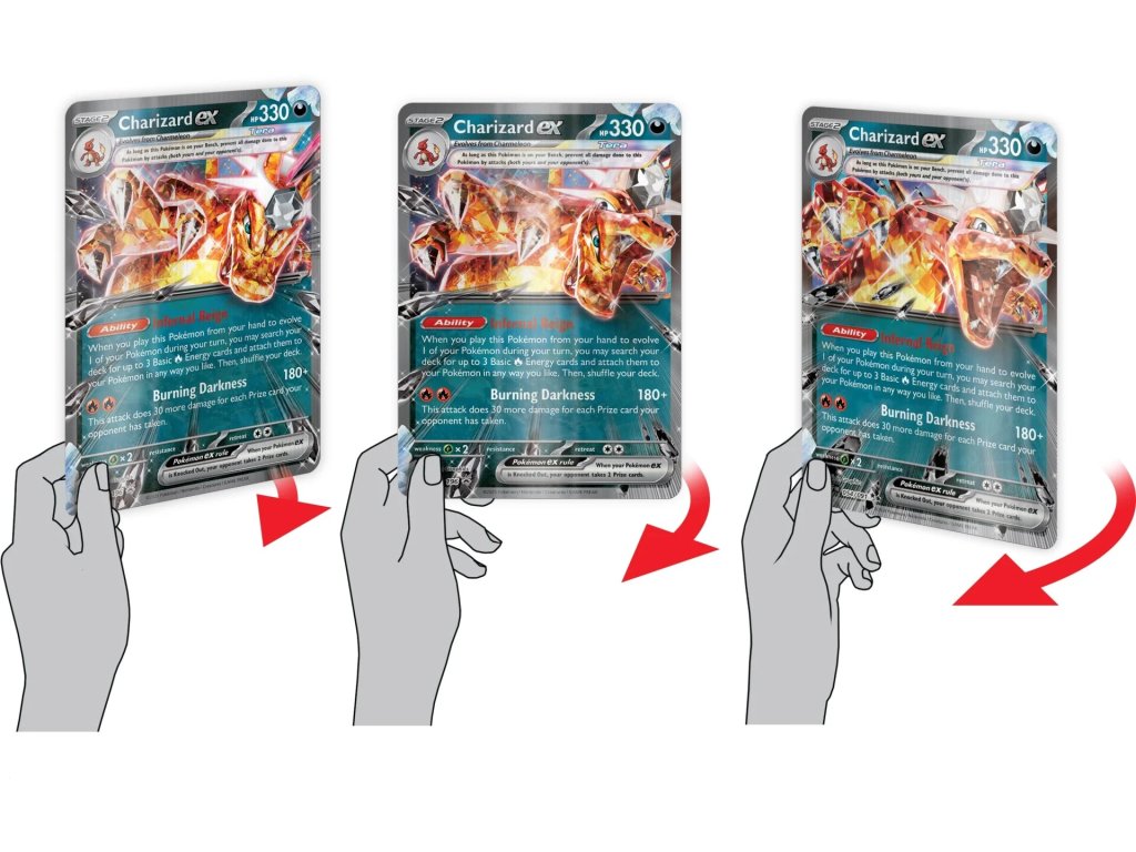 Součástí balení je také lentikulární oversize karta Charizarda ex – nakláněním karty se mění její vzhled!