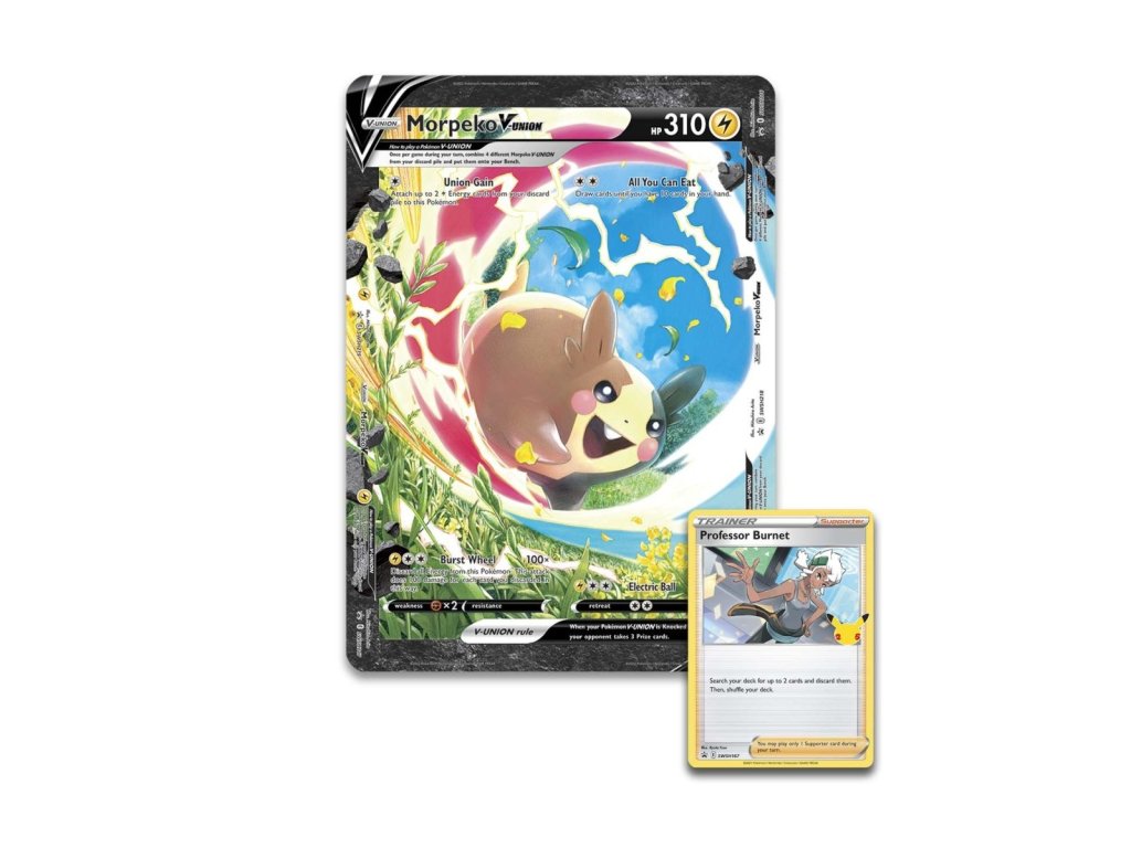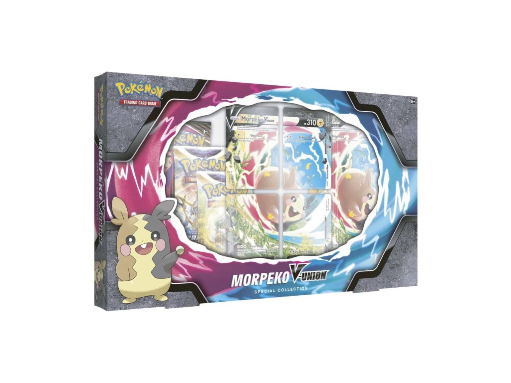 Malý, ale odvážný Morpeko se představuje jako Pokémon V-UNION! S pomocí Profesorky Burnetové můžete sestavit Morpeko V-UNION a využít jeho pestrou škálu útoků, které vám umožní nasávat Energii a další užitečné karty a zasáhnout soupeře pořádnou dávkou poškození! Součástí kolekce je i velká karta na vystavení a balíček boosterů plný dalších překvapení.