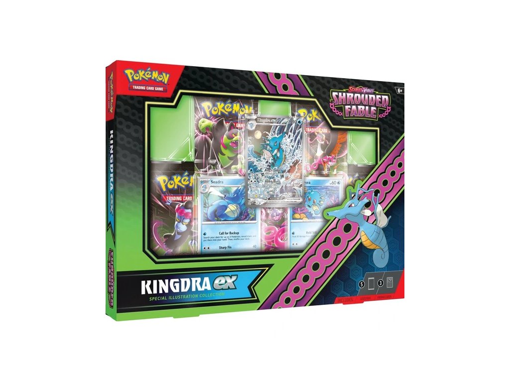 Produktu Pokémon TCG: Scarlet & Violet - Shrouded Fable Special Collection Kingdra ex dominuje promo karta Kingdra ex (SVP 131). Kromě ní však v balení naleznete i její podevoluce Horsea a Seadra. Dále si můžete rozbalit 5 boosterů Pokémon TCG: Scarlet & Violet - Shrouded Fable a pokusit se tak ulovit ještě například naše oblíbené karty jako Houndoom 066/064 (SFA 066) nebo Zorua 075/064 (SFA 075)! A samozřejmostí je pak také kód do Pokémon TCG Online.